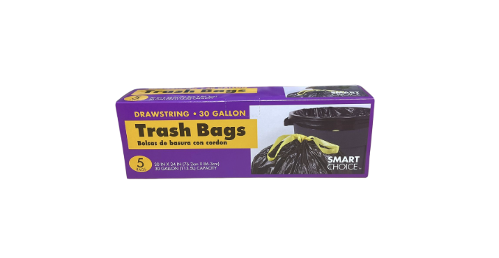 “Smart Choice Drawstring Trash Bags provide convenient, secure, and durable disposal for household waste, featuring easy-to-tie drawstrings for mess-free handling.”