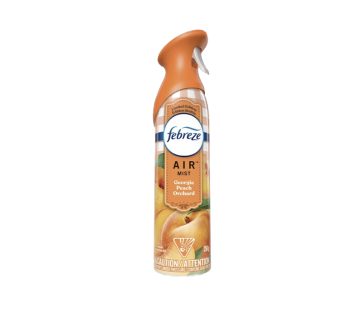 “Febreze AIR Georgia Peach Orchard eliminates odors and fills your home with the sweet, fresh fragrance of ripe Georgia peaches for a long-lasting clean scent.”