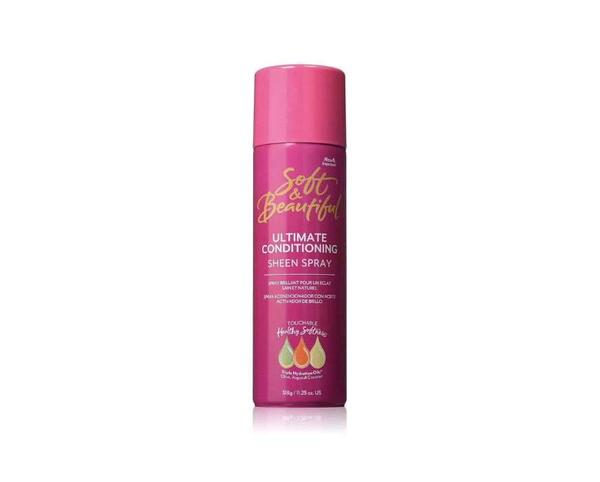 “Soft & Beautiful Ultimate Conditioning Sheen Spray nourishes and adds shine to hair, leaving it soft, manageable, and with a healthy, glossy finish.”