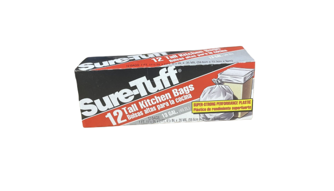 “Sure Tuff 13 Gallon Tall Kitchen Bags 12ct provide strong, durable trash bags that fit standard tall kitchen cans, helping keep your home clean and mess-free.”